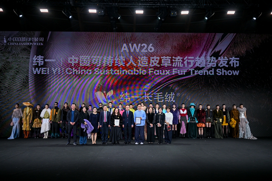 中国纺织工业联合会会长孙瑞哲,中国纺织工业联合会副会长、中国纺织信息中心党委书记阎岩,中国纺织信息中心主任胡松,中国纺织信息中心副主任张彤,中国纺织信息中心副主任齐梅,中国纺联生产力促进部副主任/中国纺织信息中心产品开发部主任陈小丽,中国纺织信息中心流行趋势部主任李晓菲等领导及嘉宾莅临现场,与众多设计师及时尚爱好者共同见证这一生态与时尚交融的华彩时刻,共襄可持续时尚发展盛举。活动中,纬一再度荣膺“中国可持续人造皮草流行趋势发布合作伙伴”称号,这也是纬一连续四次获此殊荣,宁波纬一长毛绒有限公司总经理吴叶龙登台接受了这一荣誉。