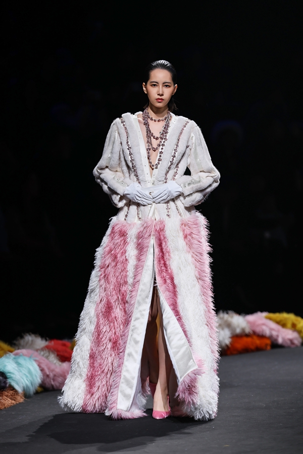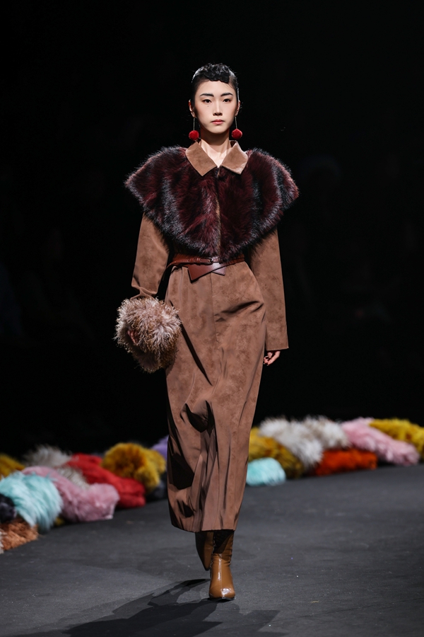 “流淌”主题凭借松弛灵动的轻暖单品,在柔雾粉蜡色与都市感亮彩的共同渲染下,映衬出治愈慵懒的现代冬日氛围。为了造就舒适浪漫的感官体验,纬一甄选一系列柔软顺滑、质地轻盈的皮草面料,以A型、茧型等宽松、流畅的优雅廓形为舞台,借由充满暖意的蓬松外观,实现对身体如云朵般的轻柔包裹,让自然随身的柔美服装,在含蓄的跃动和无限的包容中,演绎充满精致格调的绒感魅力。垂感良好的织物更以丰富的肌理和靓丽的提花效果升维视觉体验,为日常生活增添更多盎然鲜活的设计意趣。