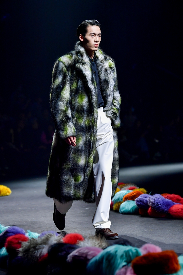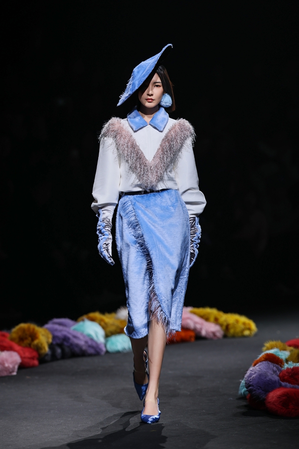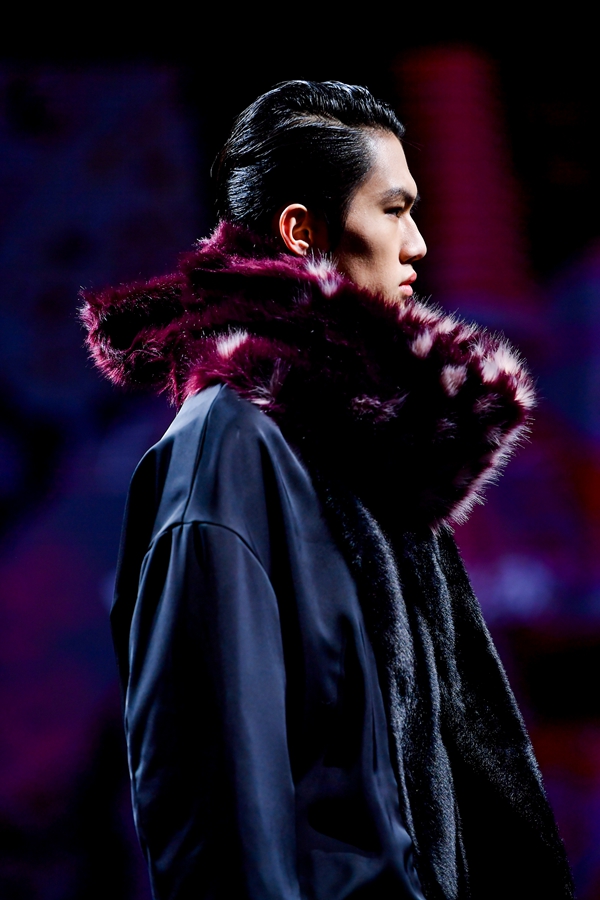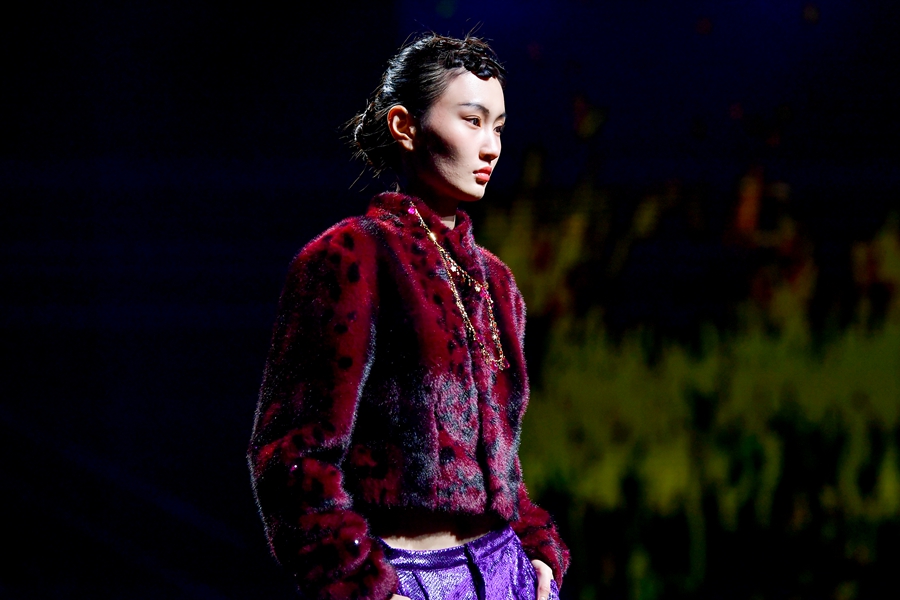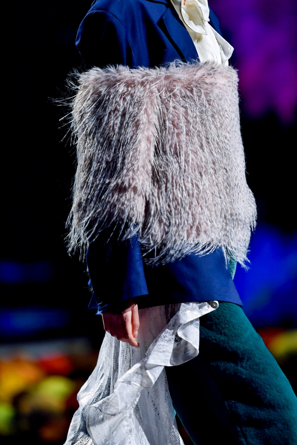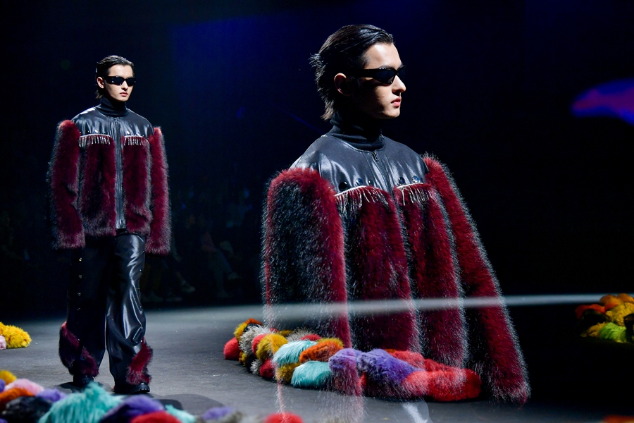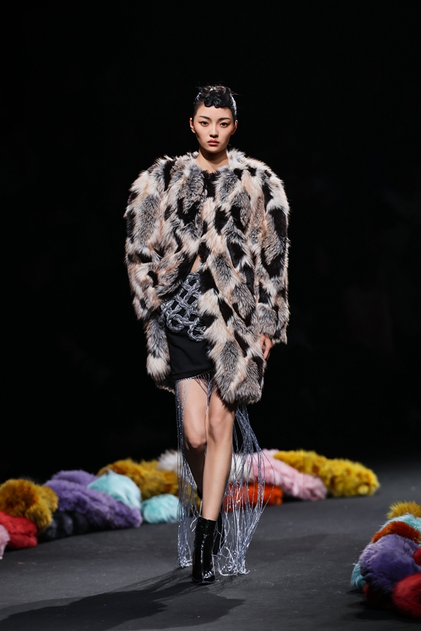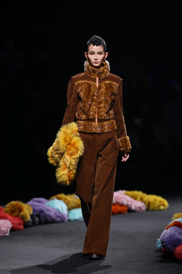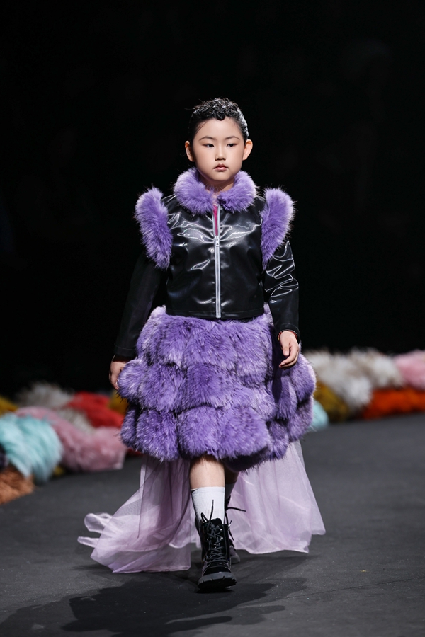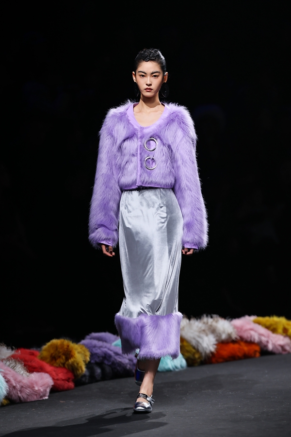 实验性的视觉语言,成为“光影”主题探索奇幻艺术与数字未来的关键。纬一以前沿工艺打造的高品质毛绒面料,通过鲜明质感的对撞,结合银莲紫、青草绿、青天蓝等酸性色调的大胆浸润,构建出如迷离霓虹般的美学场域。而织物表面的立体肌理、抽象图案、夸张兽纹,在简洁有力的廓形托举下,于虚实交错间展露强烈的视觉张力,演绎观感前卫的奢华风尚。一系列质地柔顺的皮草面料以或暗哑或华美的光泽,碰撞不对称解构廓形及层搭设计,有效回应年轻一代对个性表达与日常实穿的双重诉求。