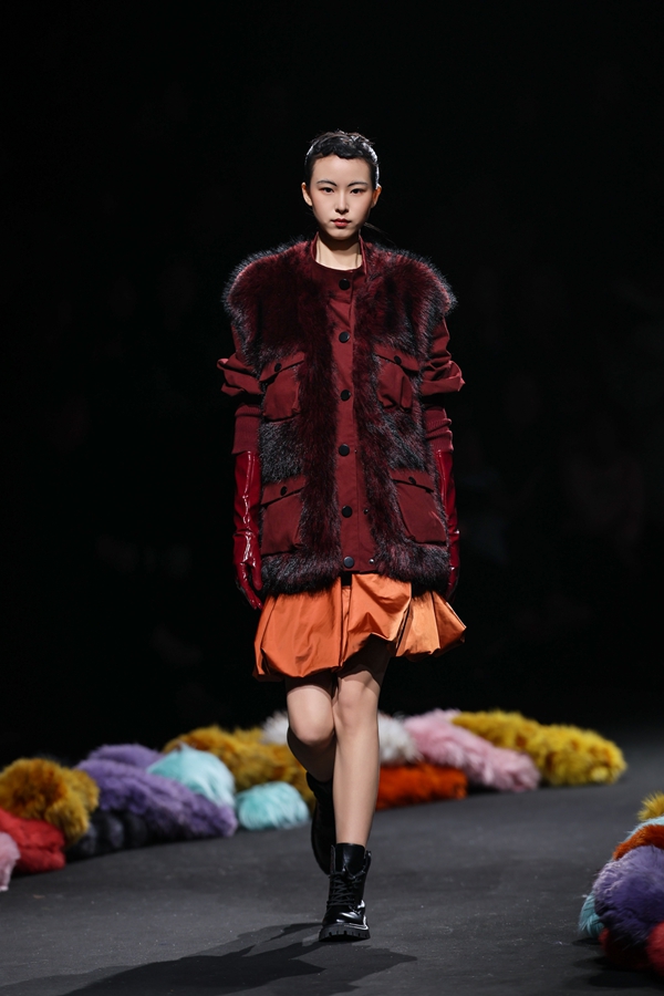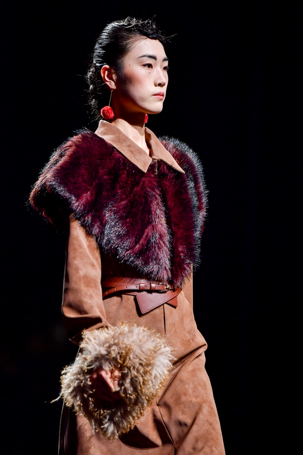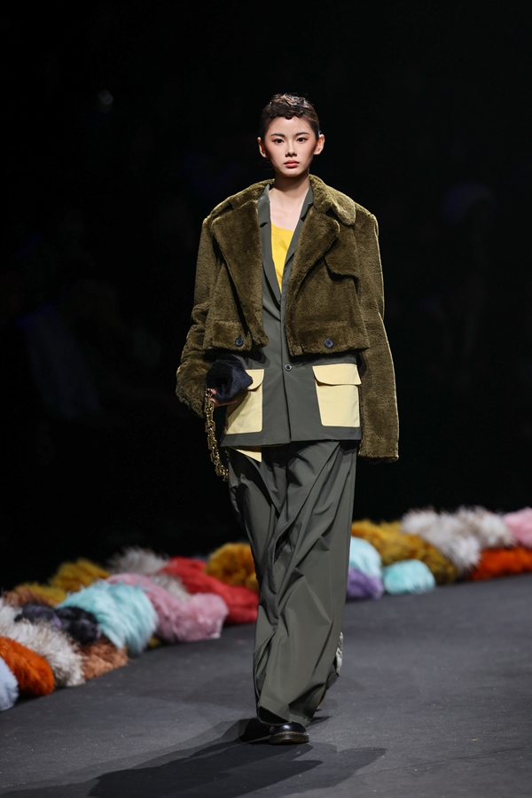 在“藏蕴”主题中,皮草设计回归复古新生、自然匠心等多重语境,打造出兼备自然主义与都市功能的系列单品。设计以香料红棕、霜草绿等“长期主义”的中性色为主调,在古韵匠心与文化包容的氛围里,传递出岁月温度与实用价值。纬一精选质感温暖奢雅的密实毛绒材质,搭配宽大松弛的廓形,完美演绎浪漫粗犷的乡野户外风格,并在长、短毛绒的组合中,为简约实穿单品强化轻机能风。而岩石地貌、生动苔藓和做旧压褶等肌理外观,则在多元化的应用场景中,铺陈出强烈的生态美学。