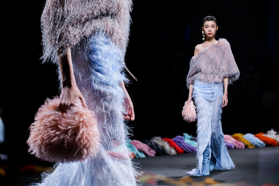 “雕琢”主题以一众实用奢华的皮草单品,诠释品质设计的永恒魅力和肃穆典雅的新古典美学。质地丰盈的毛绒织物以经典的裙装、大衣廓形为载体,通过流畅剪裁呈现出柔韧、舒展的线条,在庄重和松弛的平衡中,赋予实穿款型日夜皆宜的特色。特别值得一提的是,纬一凭借卓越的研发实力,重塑织物纤维结构和织造工艺,让仿水貂等面料还原真实的天然皮草光泽,更在鸡血石红、翠石绿等浓郁色调的交织中,结合材质拼接和微妙天然的肌理表现,让每一件单品都显露温润华美的高端质感。