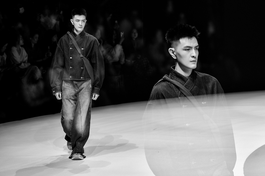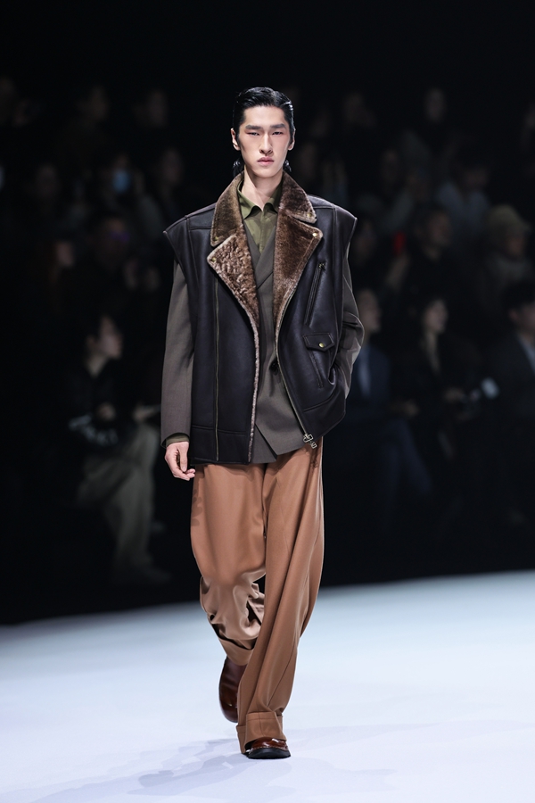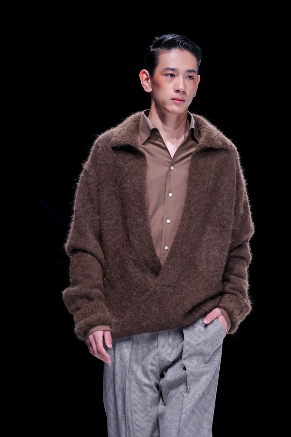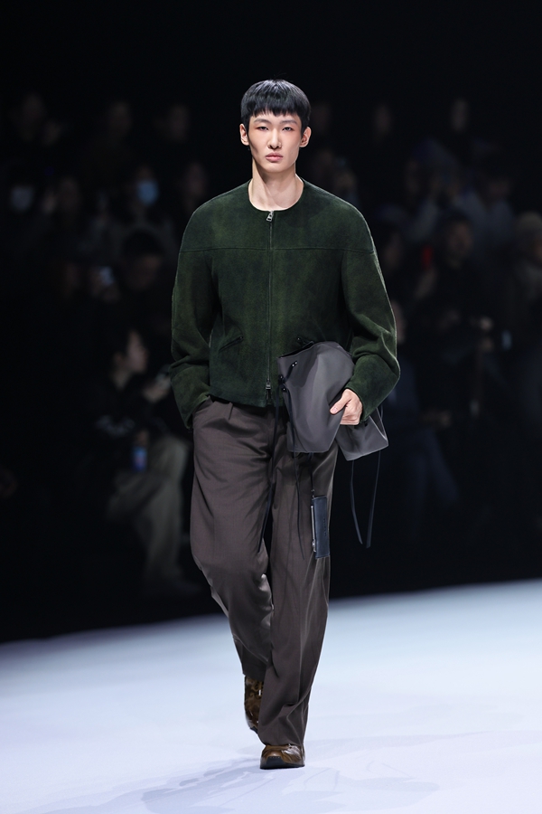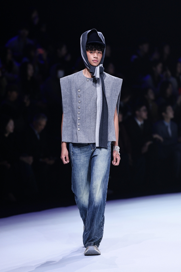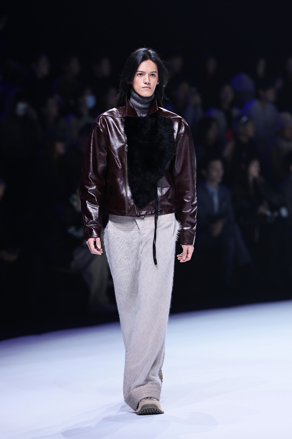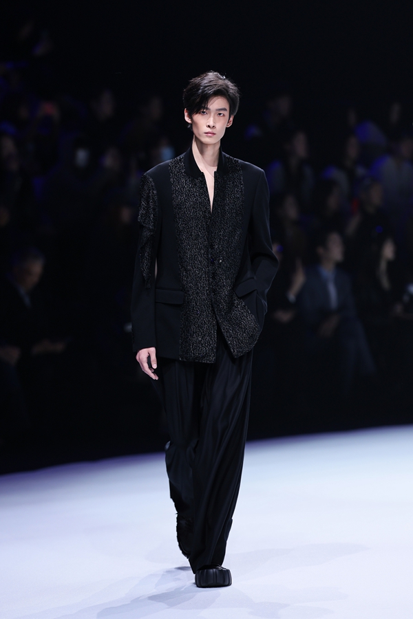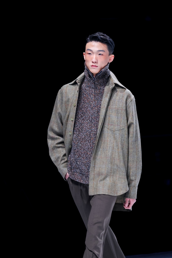 当模特身着宽松廓形的外套缓步走来,秀场氛围转向沉静。“云游”系列以年轻化的东方美学为底色,自然肌理的面料、手工感的细节、民族非遗元素的现代转译,构成一种内敛而富有温度的表达。这不是符号的堆砌,而是文化基因的当代表达。它为那些渴望在快节奏中寻得片刻宁静的人,提供了一种可穿着的“慢生活”想象。