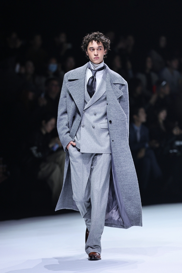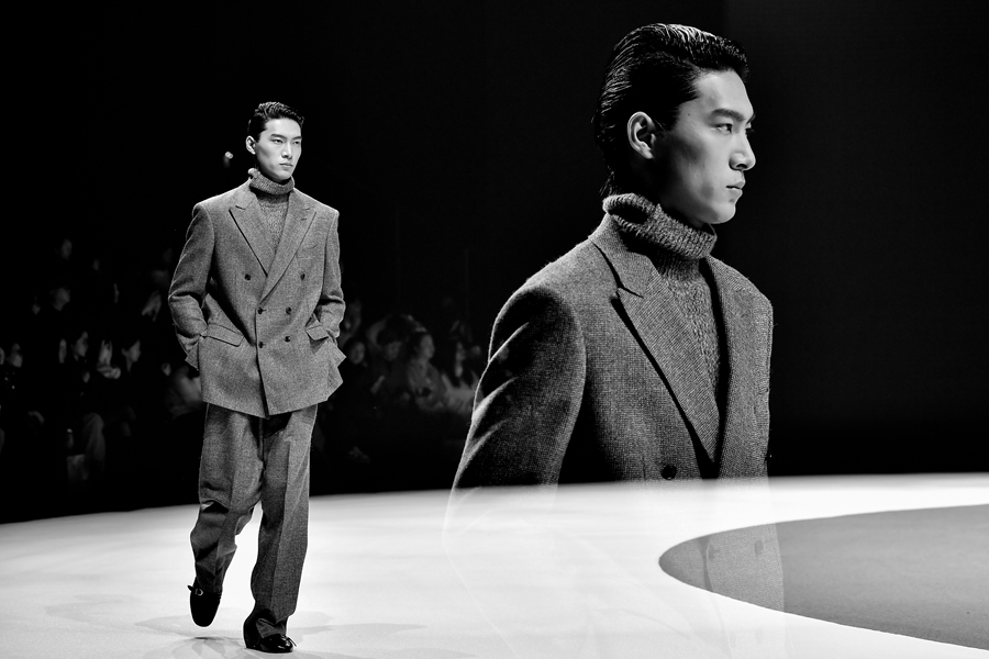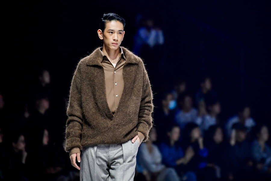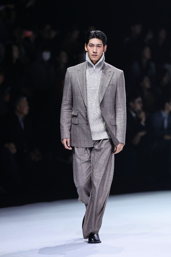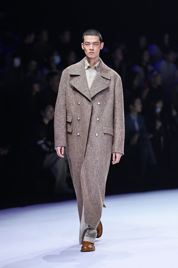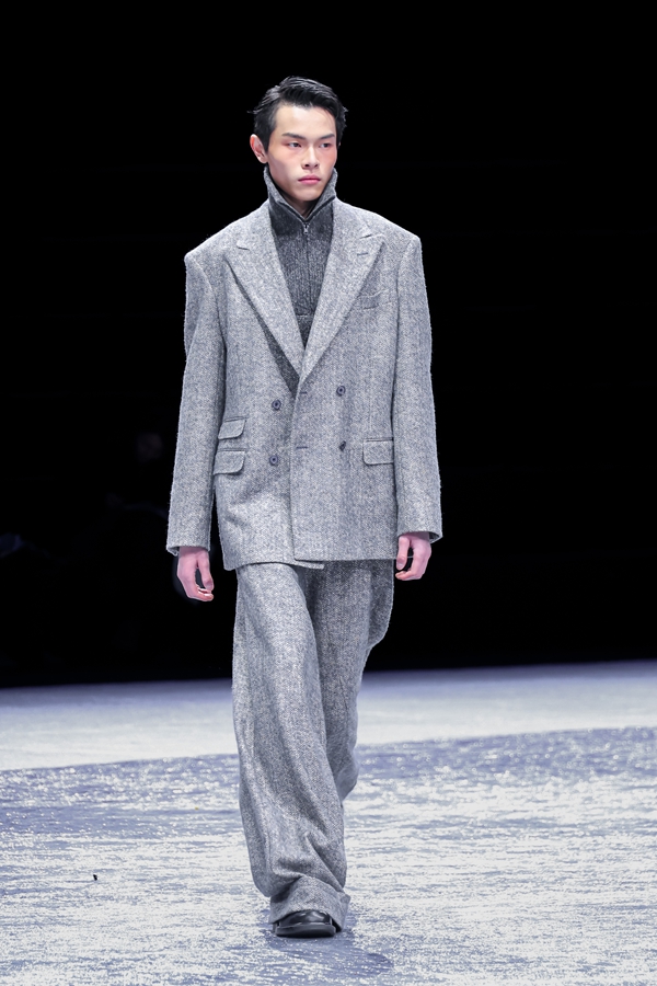 发布会伊始,模特身着线条利落、质感沉稳的通勤装缓缓登场。这一系列以“去装饰化”的设计语言,回归服装的本质:得体、舒适、耐穿。羊毛与科技面料的融合,经典剪裁的当代演绎,展现出一种不事张扬却经得起推敲的品质感。这是杉杉对“长期主义”穿着理念的视觉注解——衣物的价值,不止于当季流行,而在于岁月流转中仍能被珍视与穿着。