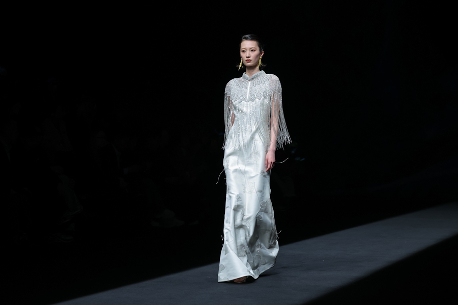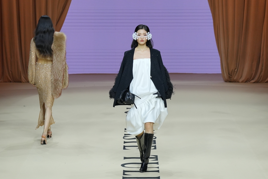 Y2FREEDOM品牌设计师胡莹莹以高端皮草面料设计,通过松弛廓形搭配利落剪裁,兼顾穿着温度与身心舒适,为高知女性打造兼具艺术感与实穿性的先锋着装;嘉兴南湖学院时尚设计学院带来产教融合师生作品发布会“界·境”,师生共创,打破皮革、皮草、织锦的技艺界限。熙颜XIYAN品牌设计师周雨君以“云和泥”演绎东方美学,将香云纱非遗工艺化作时尚华服;来自海宁市许村镇的设计师贺荣以“驰光”为主题,将传统织锦与现代设计创新融合,带去多款融入马元素的马面裙作品,让千年织锦在当代T台上焕发新生。郁香菲品牌主理人王佳华专注知性女性赛道,打造了具有文化温度与风格高度的现代女装新样板。