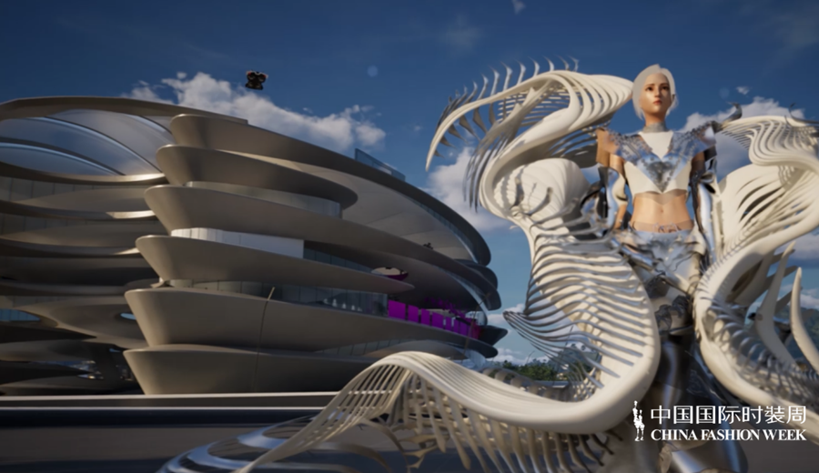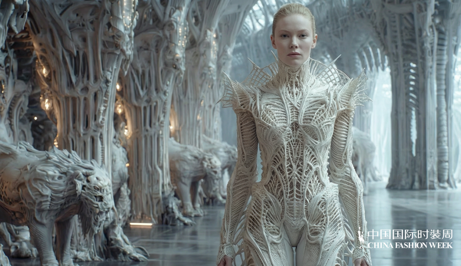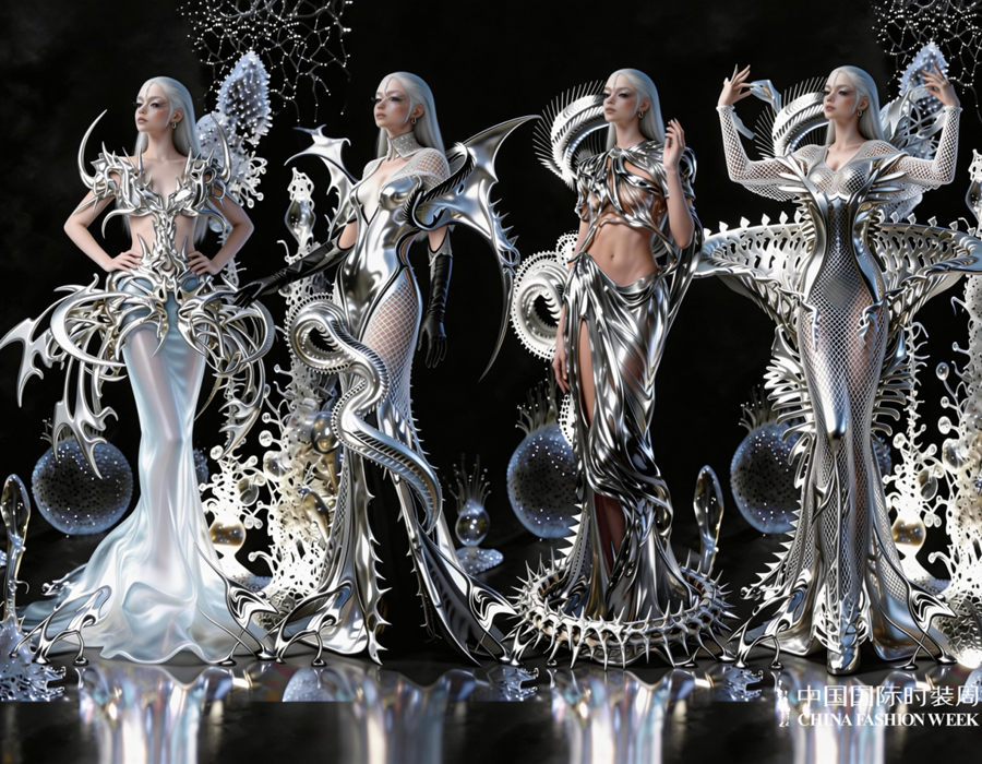 实体秀场之外,数字时尚成为“锐意新生”的重要载体。近40位青年数字设计师带来27部作品,运用AI生成、数字孪生、虚拟面料模拟等前沿技术展开先锋探索,推动数字时尚从趋势概念成长为独立表达语言。